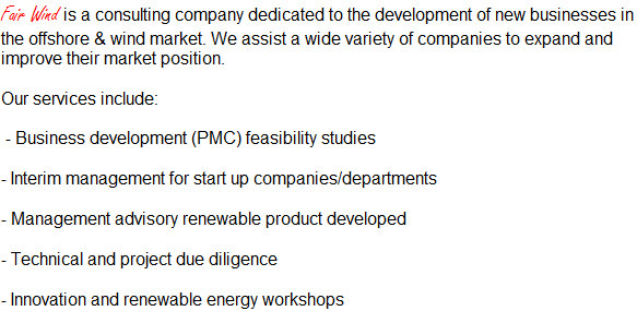 Phone +31 (0) 10 785 25 68 info@fair-wind.nl http://www.linkedin.com/in/fairwindconsultancy Our 10+ years international experience in the offshore and wind industry combined with our professional and no nonsense attitude has proven to be of great value for many customers.